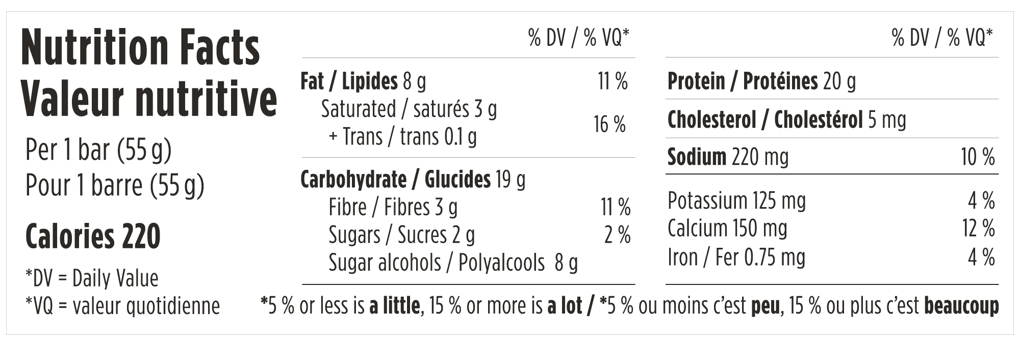 Ingrédients : Mélange de protéines (caséinate de calcium, isolat de protéines de lactosérum, concentré de protéines de lactosérum), maltitol, glycérine, collagène hydrolysé, beurre d'arachide (arachides), protéines de soja, eau, polydextrose, beurre de cacao, arachides, lait entier en poudre, pâte de cacao, arômes artificiels, sel, arômes naturels, lécithine de tournesol, sucralose.
